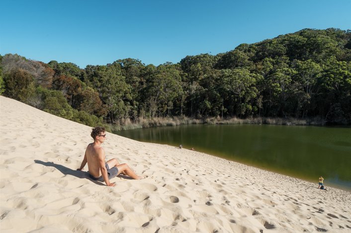 Lake Wabby/ Hammerstone Sandblow – Trek across the golden, desert-like sands and arrive at the hidden gem of Lake Wabby, an absolute emerald oasis.