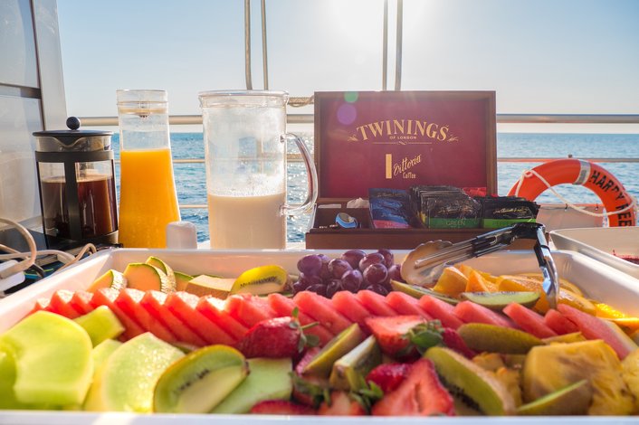 All this sea air makes you hungry. Throughout the day curb your hunger with morning and afternoon tea and a sumptuous buffet lunch. Fish D'Vine, a leading restaurant from Airlie Beach supply our catering, taking care to base the menu on seasonality and the best produce available. Free tea and coffee is available and there is also a bar onboard serving a full range of alcoholic and soft drinks. A delicious breakfast and à la carte dinner is also included.