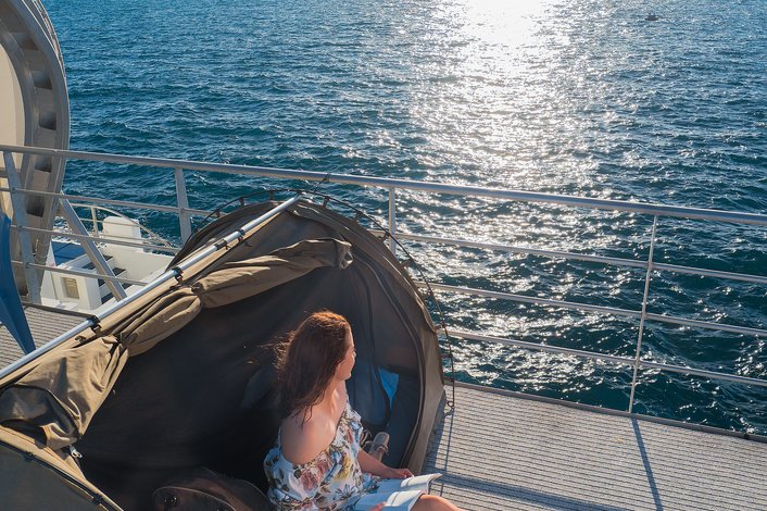 As dusk approaches watch for turtles surfacing or coming to nibble the seaweed around the pontoon. Watch as the sun sets over the reef while you sip your sundowner and then see the reef really come to life in the darkness of the night. Gaze up at a gazillion stars from your comfy swag set up on the top deck of the pontoon before the tranquillity of being in the middle of the ocean lulls you to sleep.